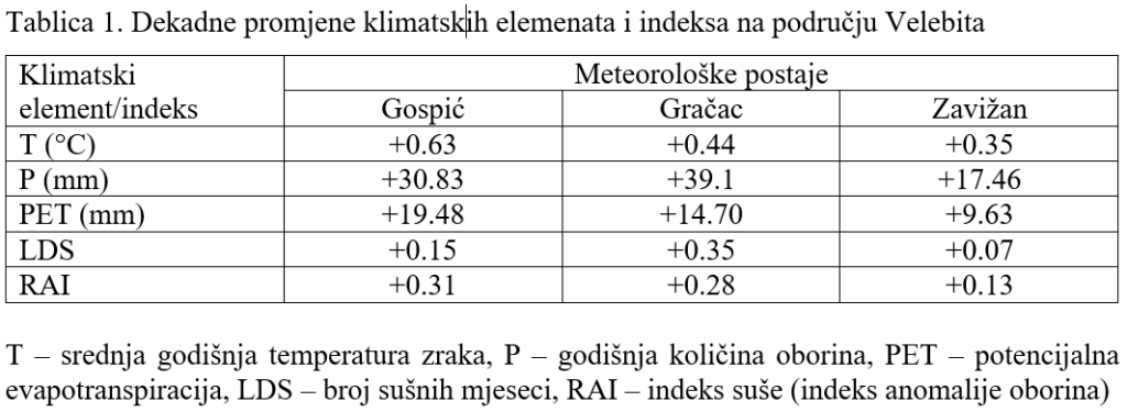 Srednja godišnja temperature zraka u razdoblju od 2011. do 2023. povećana je za od 1,0 do 1,4 °C, pokazala je analiza mjerenja u Gospiću, Gračacu i na Zavižanu. Potencijalna evapotranspiracija za ovo razdoblje također je statistički značajno poraslo u odnosu na referentni niz.