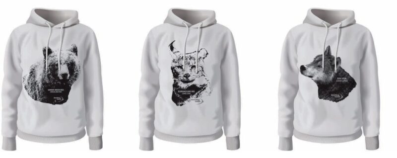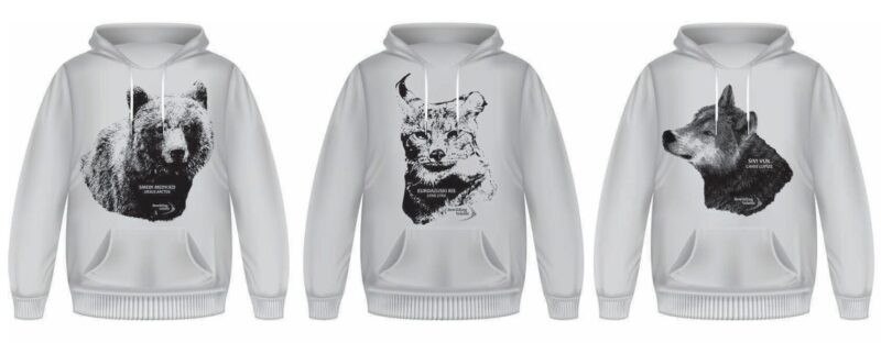 We have recently produced several promotional products that bear images of wild animals that we love so much and try to protect them. We made illustrations of lynx, wolf, and bear and one joint illustration of all three big beasts and applied them to T-shirts, hoodies, bags, notebooks, and notepads.